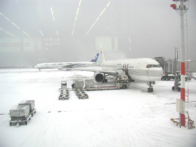 JAL599機ボーイング767は無事に函館空港に到着しました。機内から大きな拍手がおきました。 なるほど着陸してみた驚きました。滑走路は雪、吹雪で視界はゼロに近い状態です。全くのレーダーによる誘導着陸ですが、全くの見事な着陸でした。(^^ゝ 撮影:Ma |