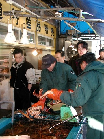 いけすから売れたカニを引き上げる店のお兄ちゃんたち。といっても同じくらいの年代ですが) 働く男、カッコイイ。(^^ゝ 撮影:Mi |