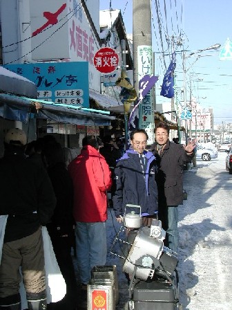 北海道特産品販売の裏手にある味の二幸 北海道特産品販売のお兄ちゃんが「店の裏のイクラ丼おいしいよ。食べていったらどう?」 その言葉に3人がトライ。食欲旺盛な人がウラヤマシイ!! 撮影:N |