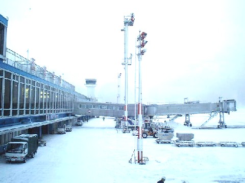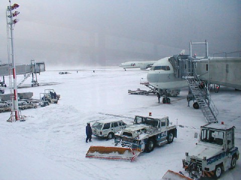 JAL599機ボーイング767は無事に函館空港に到着しました。機内から大きな拍手がおきました。 なるほど着陸してみた驚きました。滑走路は雪、吹雪で視界はゼロに近い状態です。全くのレーダーによる誘導着陸ですが、全くの見事な着陸でした。(^^ゝ 撮影:Ma |