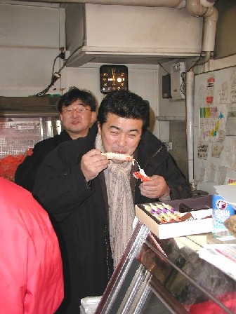 試食用のタラバカニをほおばる (註:しばし休息をとるH刑事には、背後に謎のロシア人が迫っていることに気がついていない!) 撮影:Mi |