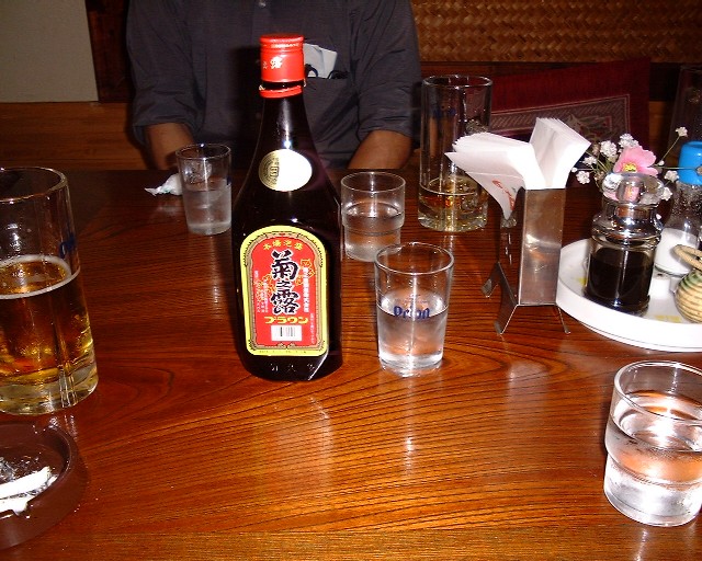 菊の露のスタンダード品 現地では700円位で、本州では990円で販売されている晩酌用のスタンダード製品。前夜にいただいた上級品とは違いますが、ほんのり香りが漂い美味しい泡盛。宮古島ではロックか水割りで飲むようです。 |