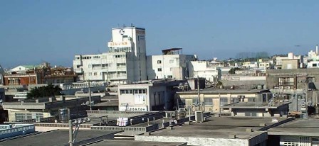 手前の2階建て 奥に高いのが平良市役所?! 見学した宮古ケーブルTV(MTV)屋上から |